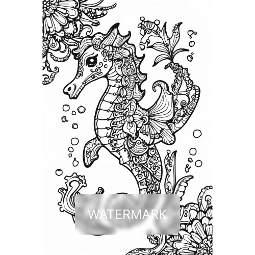 This enchanting black and white illustration, titled "Majestic Seahorse Mandala".
