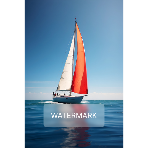 Captures the tranquil beauty of a white yacht with striking red sails, gliding through the calm blue waters.