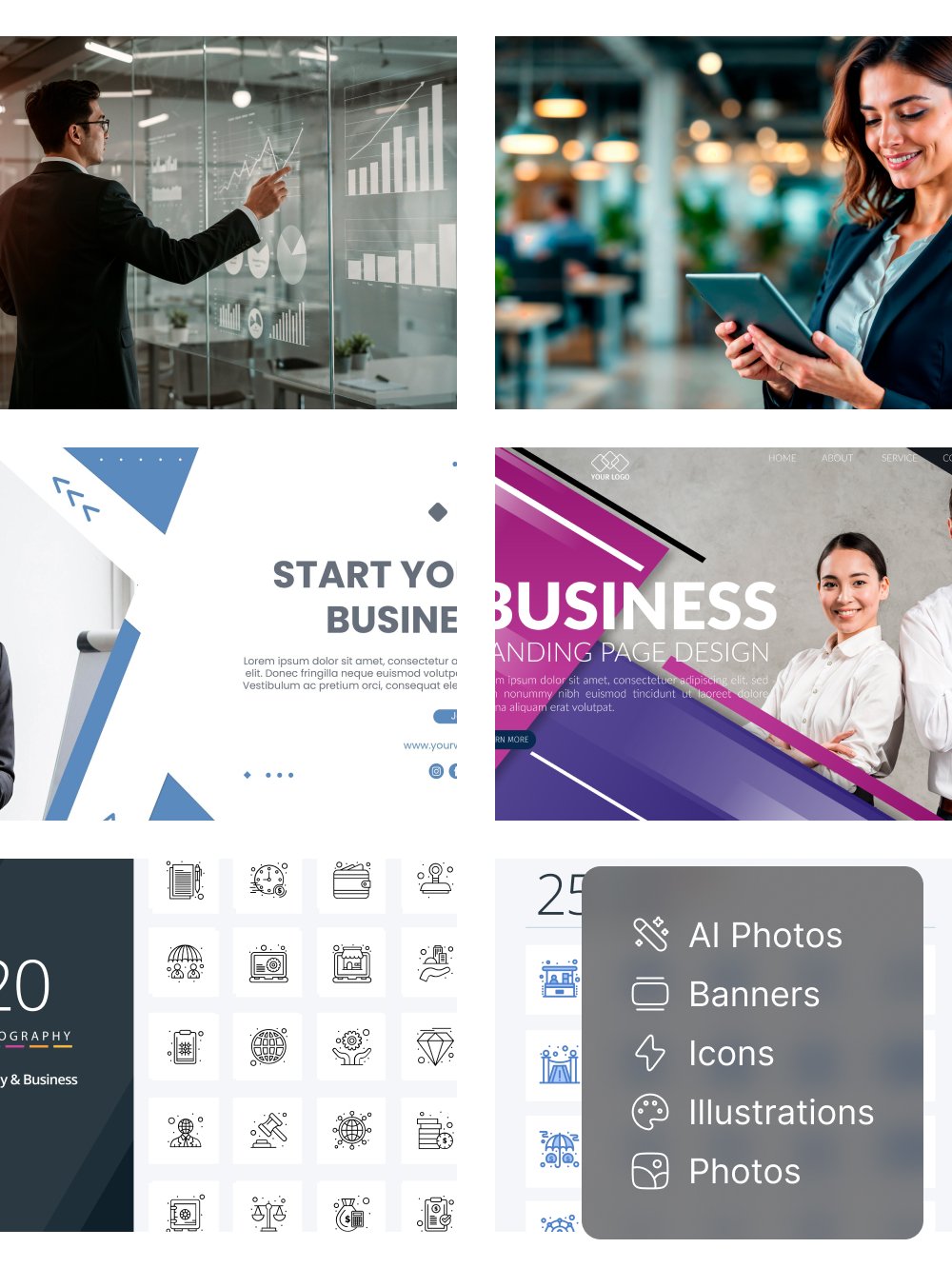 In addition to photos, the pack contains ready-to-use banner designs perfect for websites, digital ads, and social posts. Professional, minimal icons are included to help you visually support your content in interfaces, pitch decks, or apps. Modern vector-style illustrations are also part of the collection, offering a creative yet clean way to communicate business concepts.